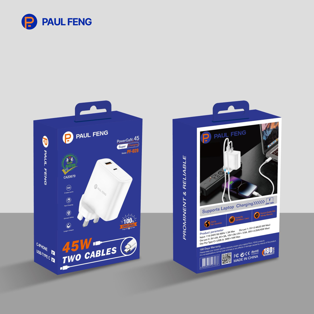 Charge smarter and faster with the Paul Feng PF-029 PowerGaN 45W Super Charger. Engineered with advanced GaN (Gallium Nitride) technology, this compact yet powerful charger delivers high-speed charging for laptops, smartphones, tablets, and more — all in one sleek package.